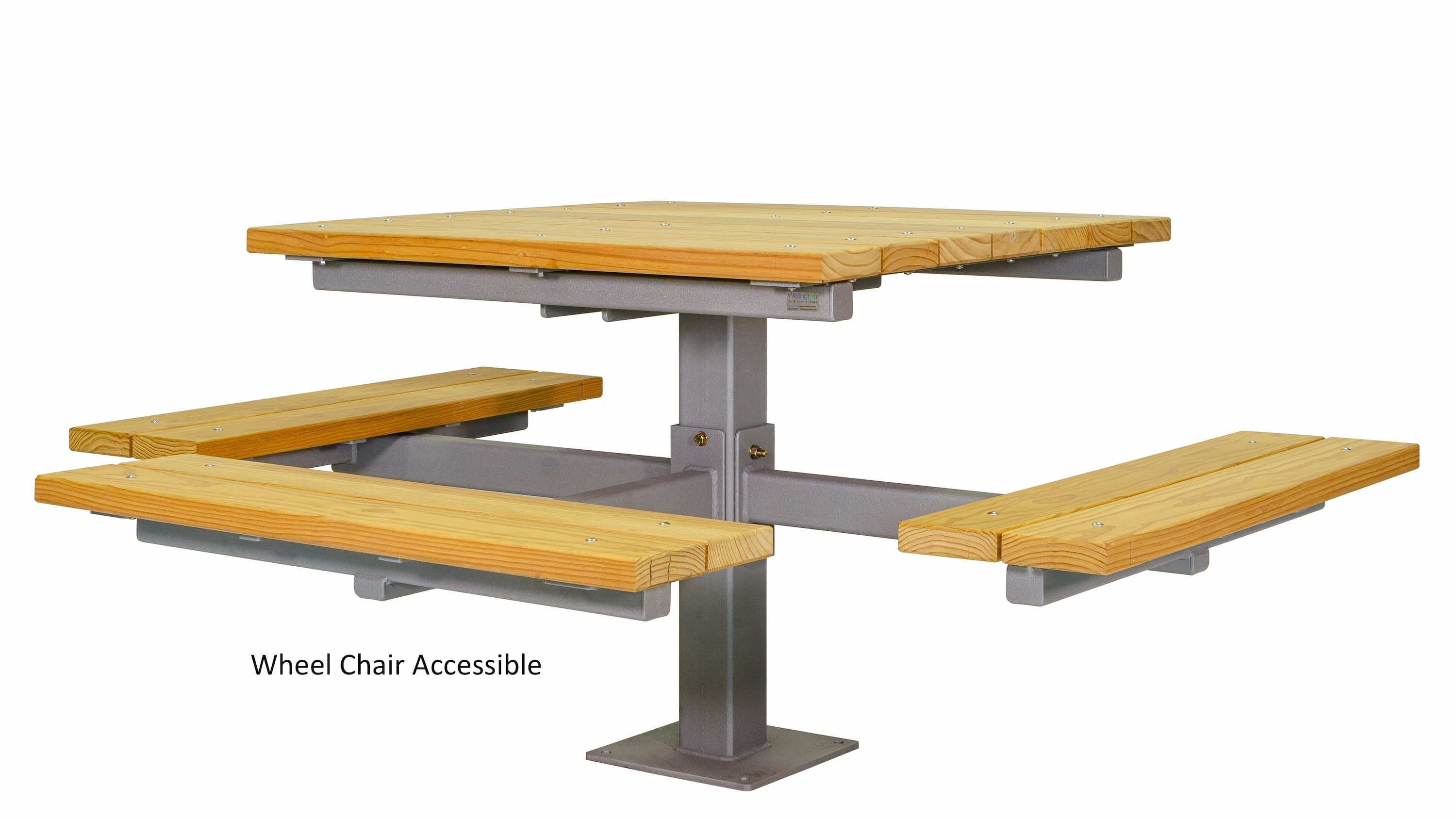 The single pedestal table is one of our tried-and-true designs going back to the inception of Wishbone. All of the tables we have supplied in the last 15 years are still in use and continue to perform beyond our customers’ expectations. This is in part due to the heavy-duty steel frame, and low-maintenance recycled plastic lumber. To ensure the tables lifespans are lengthened even further, we are now sandblasting and applying a Zinc Primer coat to the steel frames prior to powder coating ensuring maximum rust resistance. This table continues to be popular year after year for many reasons. The single pedestal picnic table has a significantly smaller footprint compared to a standard picnic table, works great as a game table where everyone is engaged and comes with a few options such as direct burial or surface mount. It can be wheelchair accessible by omitting one of the seats (see Installation Gallery).
